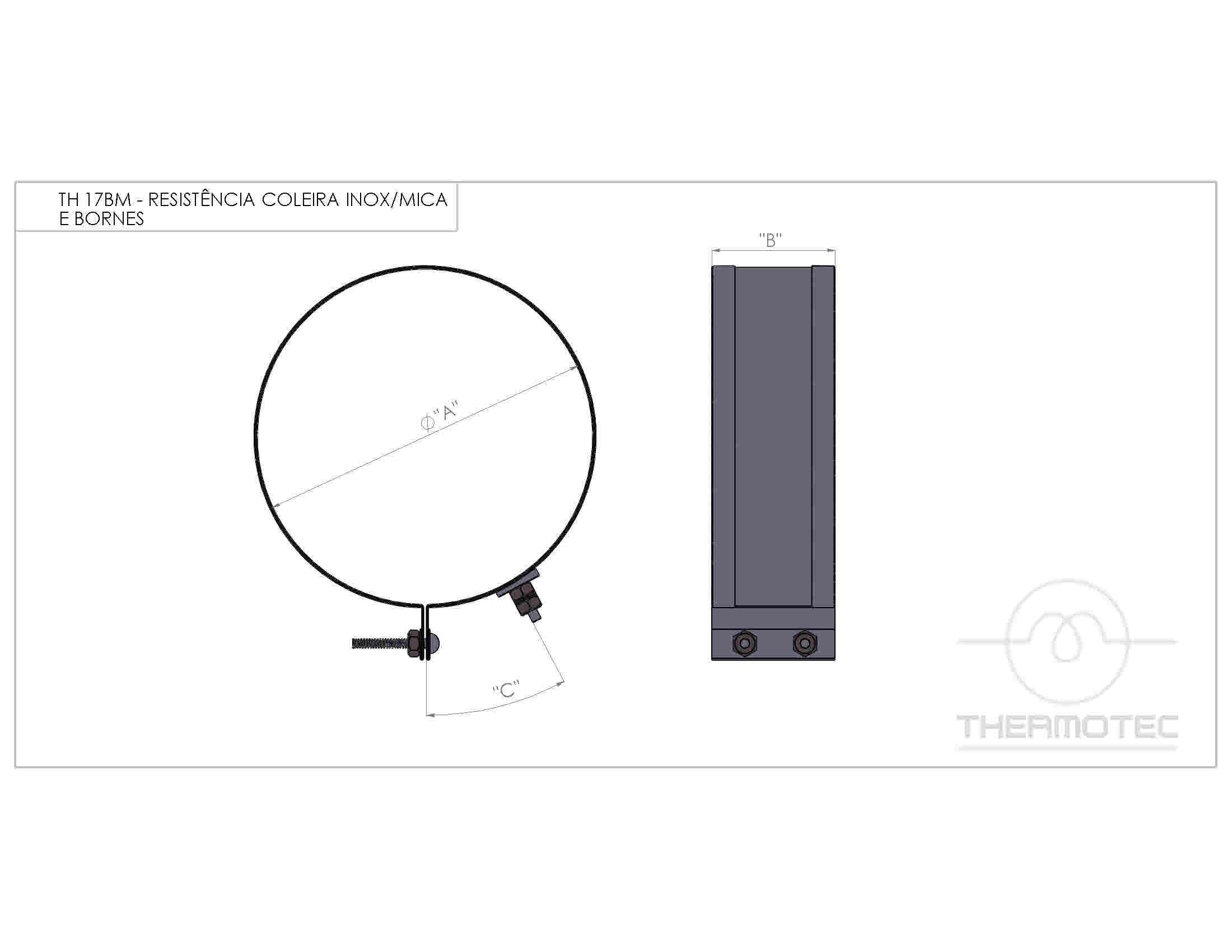 Fabricada em aço inox 430 com isolação mica, com ligação bornes mesmo lado e fechamento orelha.